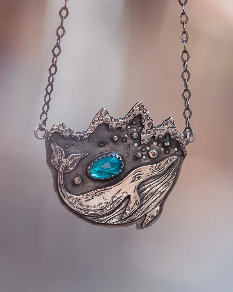 Οι φάλαινες είναι από τα πιο μαγευτικά πλάσματα του ωκεανού. Πελώριες, πανέξυπνες κι ευγενικές προκαλούν δέος σε όποιον έχει την τύχη να τις δει ελεύθερες και χορεύουν με τα κύματα και να τραγουδούν. Αυτό το μενταγιόν, με τον υπέροχο απατίτη, σου χαρίζει λίγη από τη μαγεία τους.