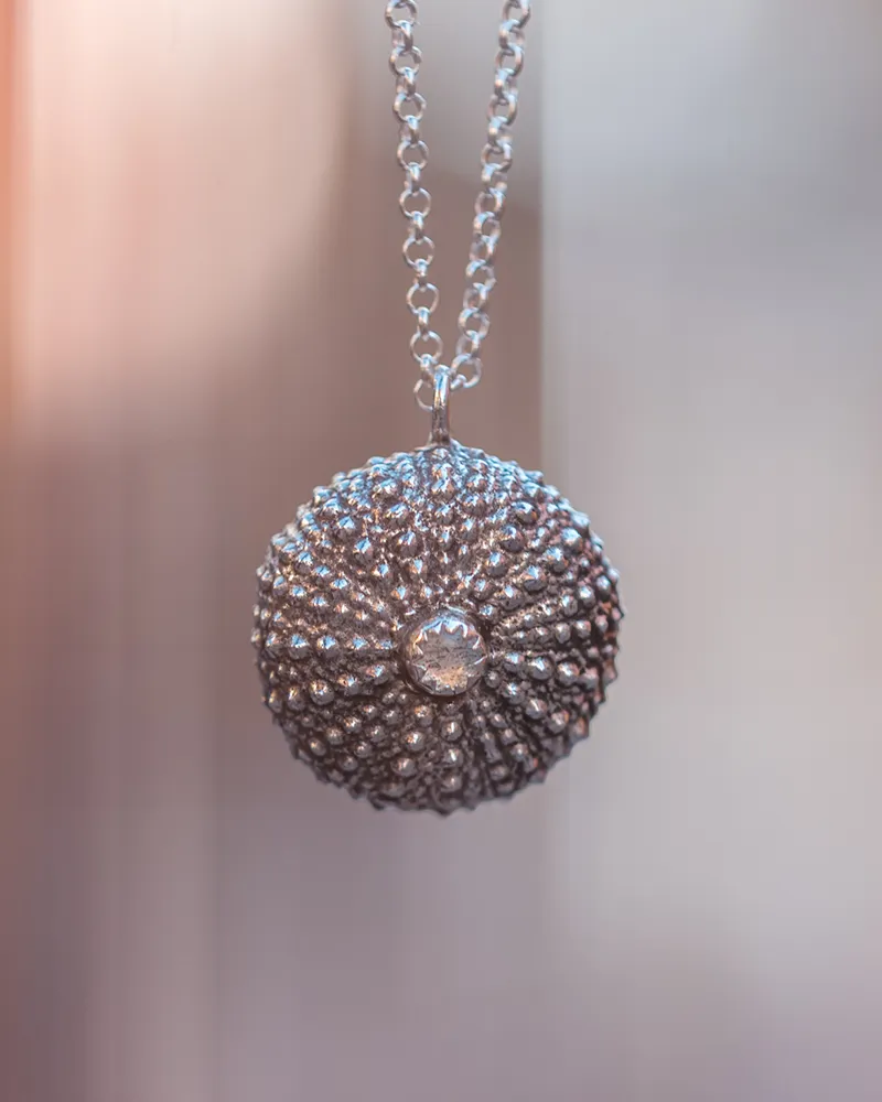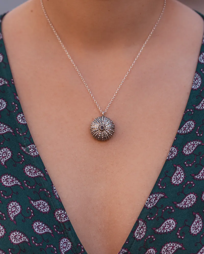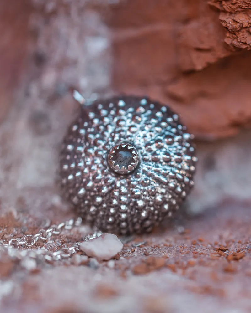 A unique, silver, sea-urchin pendant with a tiny labradorite, you will love from the very first moment. It is handmade to remind you of white sandy beaches and deep blue seas and bring you a bit closer to unexplored places every time you wear it.