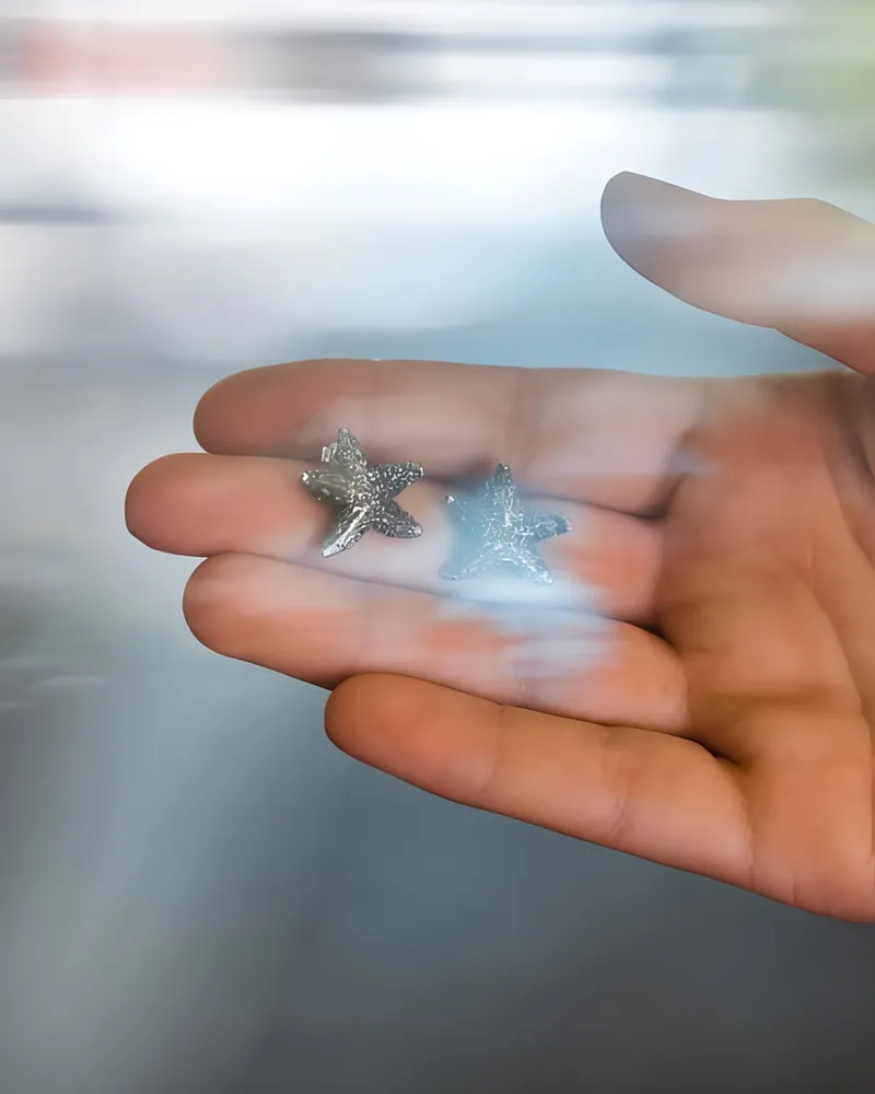 Ένα ζευγάρι ασημένια, ανάγλυφα σκουλαρίκια-αστερίες, μικρά και διακριτικά. Μπορούν να φορεθούν από το πρωί ως το βράδι και να δώσουν μια στυλάτη, καλοκαιρινή πινελιά στο ντύσιμό σου.